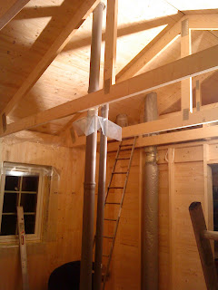 Vi börjar så smått fundera på vattendragning. Det och all ledningsdragning (el, tv, tele, it) måste också till innan vi kan lägga golv i övervåningen, så ett tag till får vi balansera omkring på plankor och bjälkar när vi är på övervåningen.
